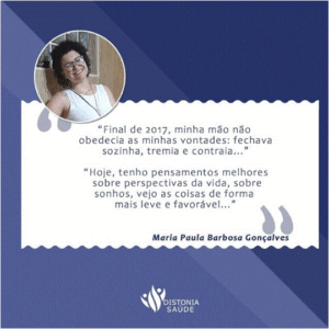 No final de 2017 tive o primeiro sintoma na mão, onde percebi que ela não obedecia as minhas vontades, fechava sozinha, muito tremor e contração. Depois em 2018 comecei a sentir como se estivesse com torcicolo e deixei passar, quando em 2019, tive uma crise onde o pescoço, mão, perna esquerda obedeciam meus comandos, apresentava muito tremor e contrações, com isso muita dor. A grande mudança em minha vida é que foi necessária uma reabilitação profissional.
