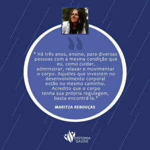 O que aprendi sobre a distonia, é que nesta luta preciso estar sempre em movimento; trabalhar o autorrelaxamento; praticar a automassagem; mantendo uma respiração profunda e completa para administrar a doença.