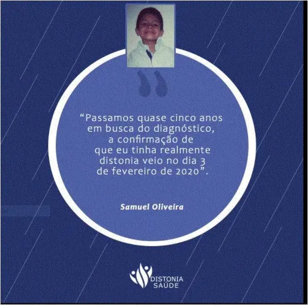 Meus CIDs são: G24.9 – distonia sem especificação (generalizada, em mais de três partes do meu corpo); F81.9 por outros transtornos do desenvolvimento escolar (não leio ainda e tenho a escrita prejudicada pelos espasmos na minha mão direita) e R 47.1 disartria e anartria – fraqueza nas cordas vocais e dificuldade de fala”, acrescentou o menino Samuel Oliveira.